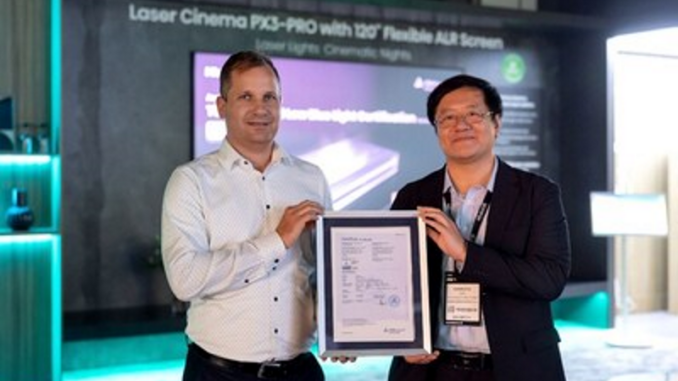 Certifikát byl předán na slavnostním ceremoniálu za účasti Dr. Liu Xianronga, hlavního vědeckého pracovníka a generálního ředitele společnosti Hisense Laser Display Co. Ltd., a Zsolta Peszeho, manažera pro Evropu, TÜV Rheinland, na stánku Hisense během veletrhu IFA 2024.